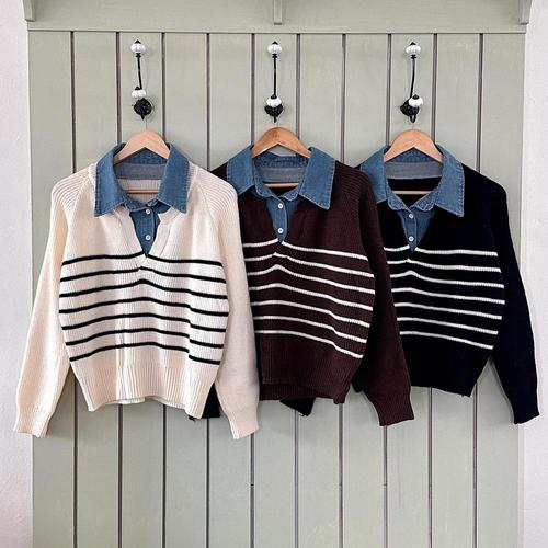 [옷자락]남녀 커플 니트 오픈카라 스트라이프 오버사이즈 겨울 티셔츠