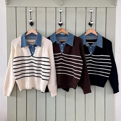 [옷자락] 남녀 커플 니트 오픈카라 스트라이프 오버사이즈 겨울 티셔츠