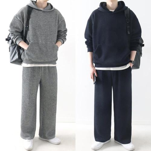 [지지블랙][SET] 델리 골지 니트 오버핏 후드 와이드팬츠 트레이닝 세트 니트 츄리닝 세트 ZZBSET074