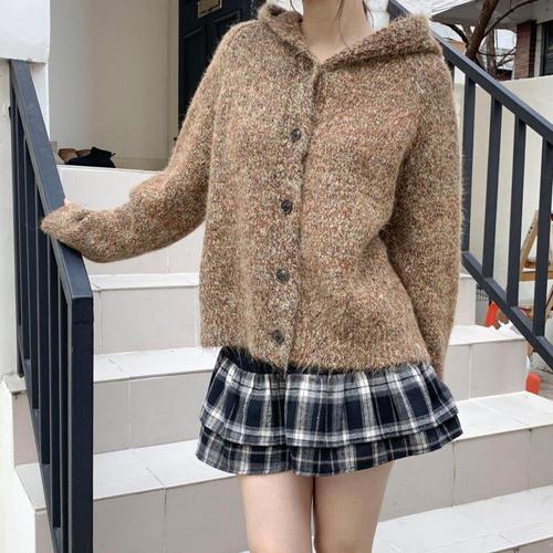 [신상오픈런]여성 클래식 루즈핏 단가라 후드 니트 단추 가디건