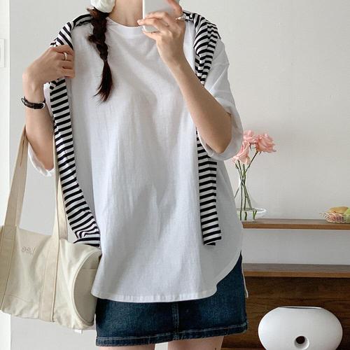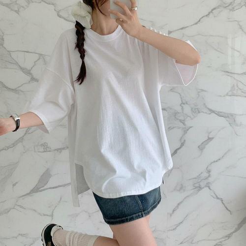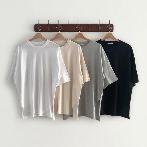 국내제작 20수 레이어드 오버핏 반팔 티셔츠 옆트임 순면 무지 롱 이너 반팔티