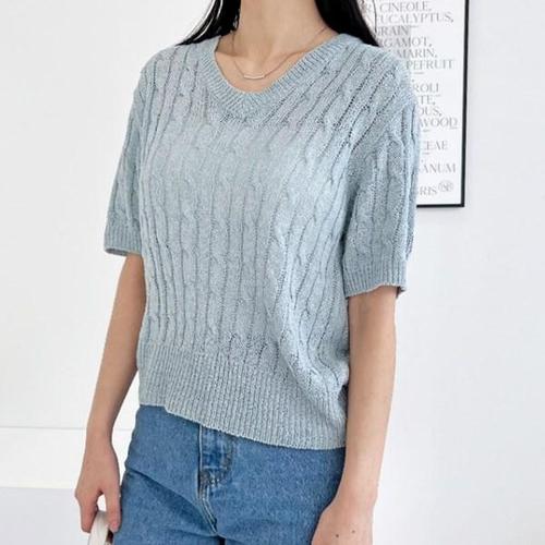 [옷자락] 여자 무지컬러 루즈핏 브이넥 케이블 반팔 니트