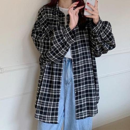 여성 오버핏 롱 셔츠 빅사이즈 루즈핏 여자 박시 남방 체크 롱셔츠 자켓 아우터 화이트 블랙