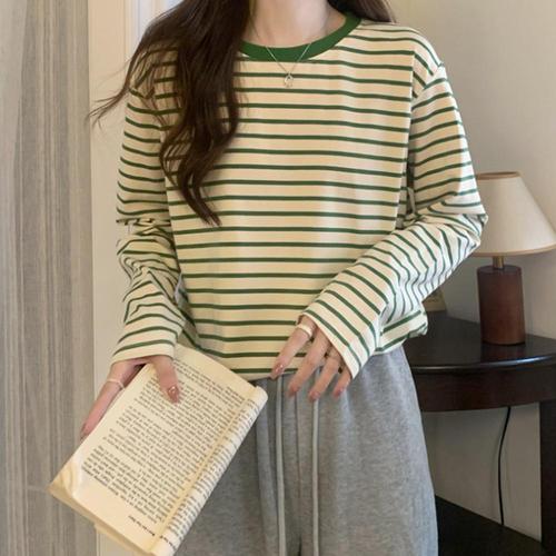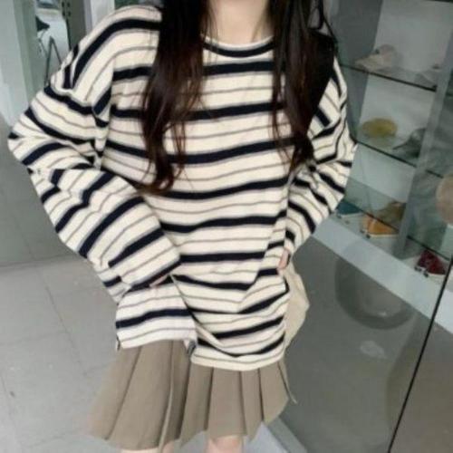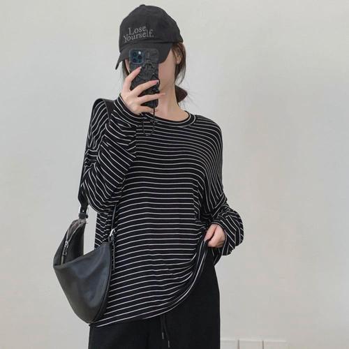 [옷자락]여자 캐주얼 배색 스트라이프 루즈핏 긴팔티
