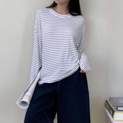 [옷자락]여자 루즈핏 라운드넥 단가라 레이온 스판 긴팔티