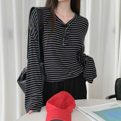 [옷자락]여성 앞트임 브이넥 루즈핏 스트라이프 긴팔티