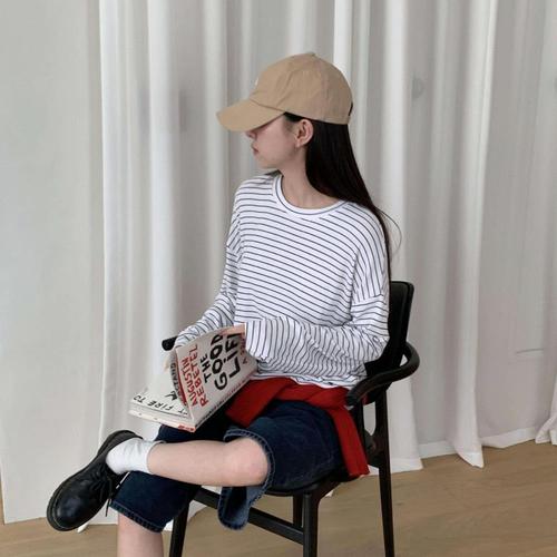 [옷자락] 여성 키치무드 스트라이프 긴팔티 라인 루즈핏