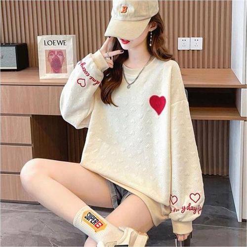 [엄지척]여성 캐주얼 오버핏 하트 레터링 엠보 맨투맨 티셔츠_19645573_667501