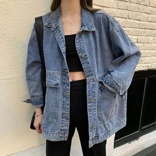 ANYOU 여성용 패션 청자켓 봄가을 오버핏 빅사이즈 데님 자켓 데일리 긴팔 루즈핏 데님 코트 청년감 스타일 클래식 청자켓