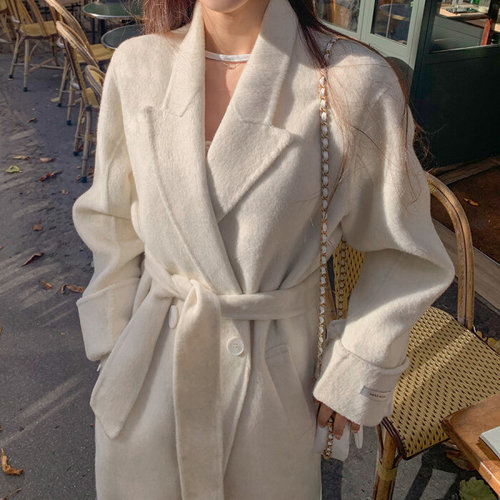 [러빙엠]루즈핏 벨트 노카라 핸드메이드 롱 코트 울 자켓 룩 (14095013)