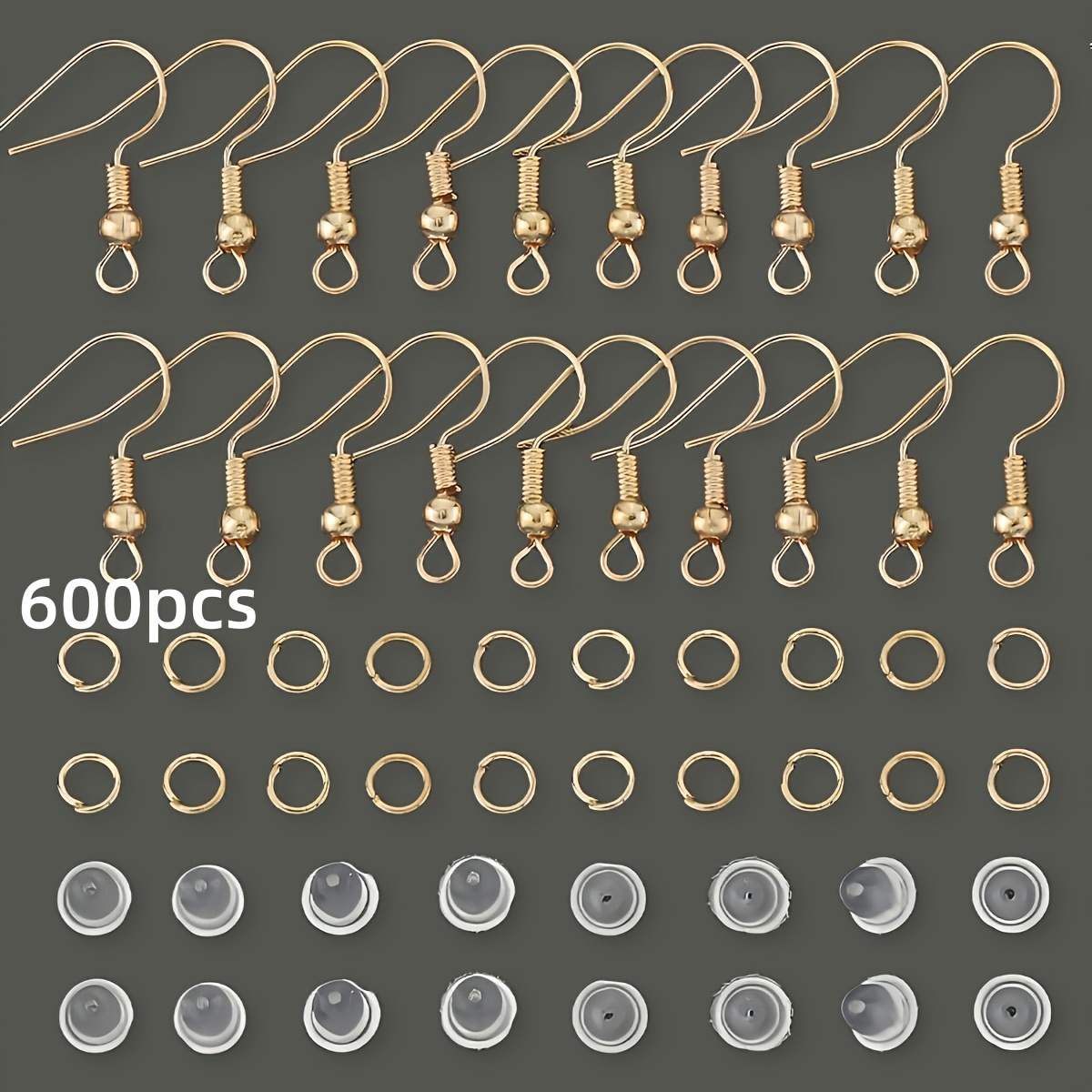 TEMU 600개 KC 골든 하이퍼센시티브 DIY 귀걸이 액세서리 세트, 100개 물고기 후크 귀걸이, 200개 투명 실리콘 귀 뒤, 300개 점프 링 포함, 보석 만들기, 귀걸이 후크, 발탄 귀걸이 뒤, 열린 점프 링, 펜던트 목걸이 커넥터, 귀걸이 귀 드롭 닫힌 원, 기타 액세서리 재료에 적합합니다.