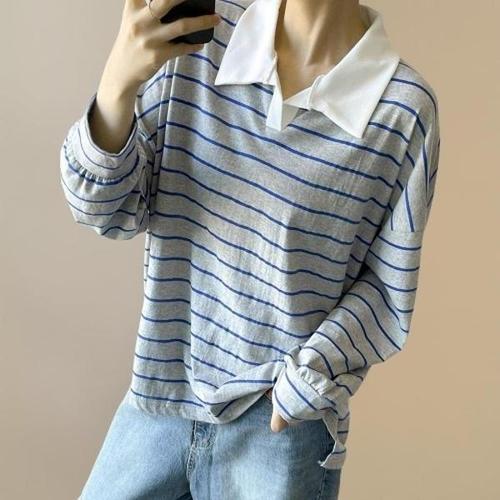 [신상오픈런]|KST99FC|여자 배색카라넥 스트라이프 오버핏 가을 긴팔 티셔츠_23201266_597559