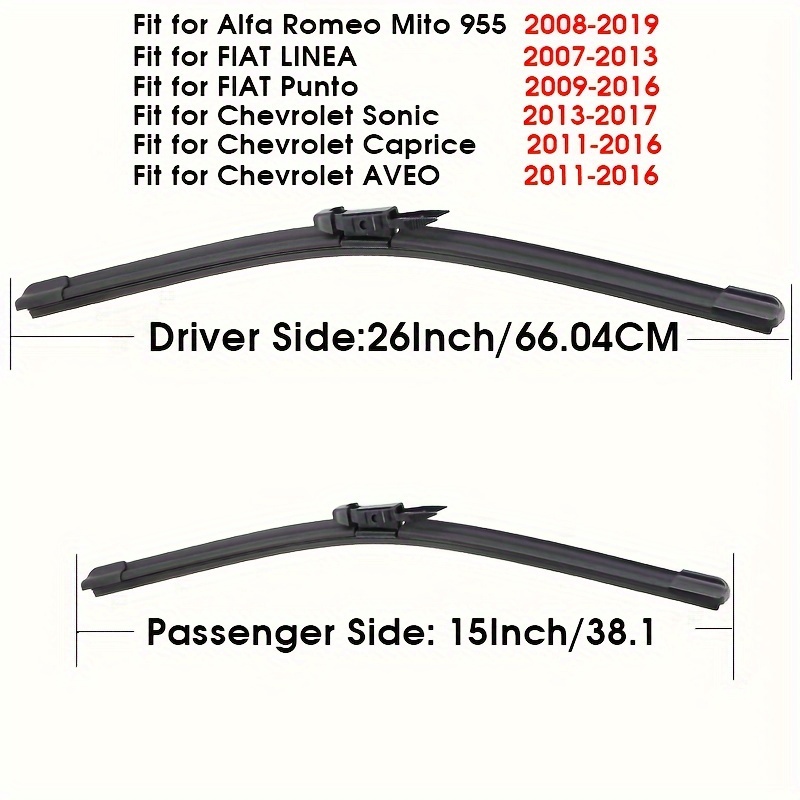 TEMU 미토 955, 피아트 리네아, 피아트 푼토, 소닉, 카프리스, 아베오용 전면 윈드실드 와이퍼 블레이드 페어 - 핀치 탭 포함 26"+15"