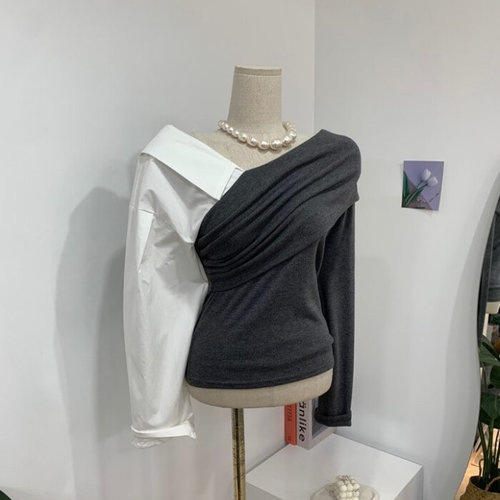 [옷자락]여성 유니크 셔츠 레이어드 오프숄더 셔링 긴팔 니트