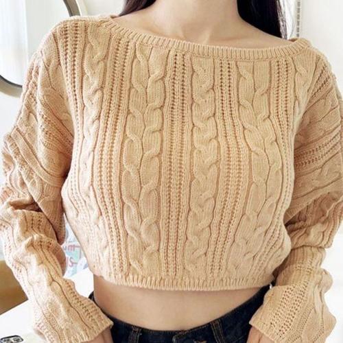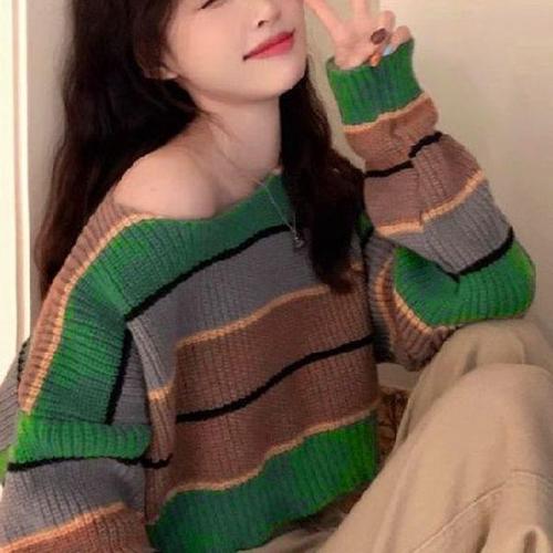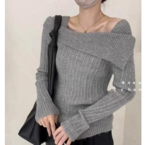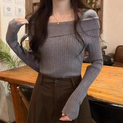 여성용 심플 청순 오프숄더 긴팔 니트 티셔츠