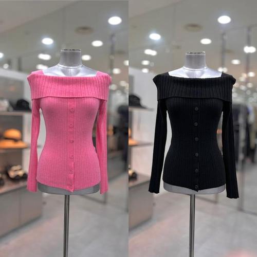 쪼예 네츄럴 언발 오프숄더 슬릿 버튼 긴팔 니트 티셔츠