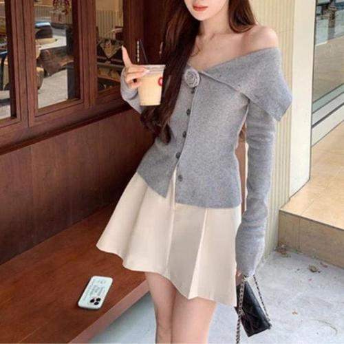 소개팅 룩 모임 플라워 코사지 오프숄더 버튼 가디건 WFL0IG8