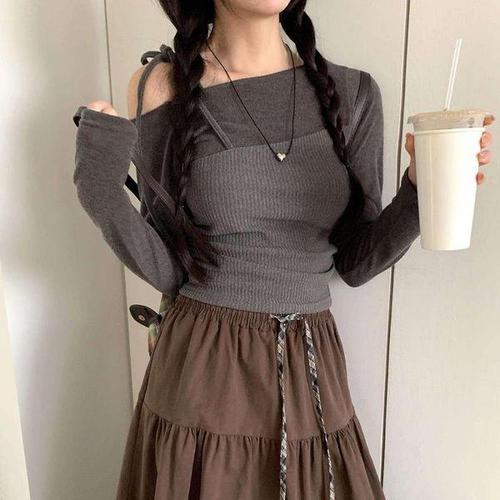 [신상오픈런]여성 레이어드 골지 셔링 오프숄더 긴팔 니트