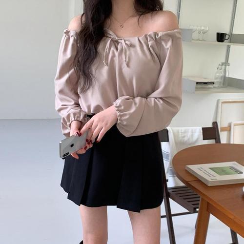 여자 리본 오프숄더 퍼프 셔링 블라우스