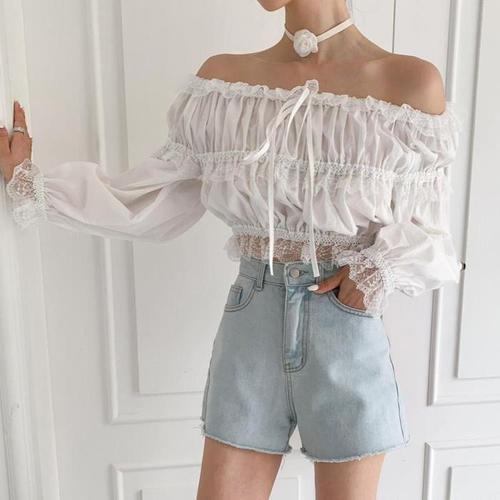 여자 리본 레이스 오프숄더 블라우스