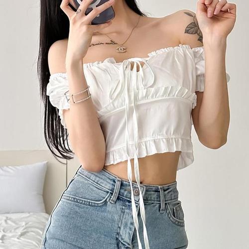 [옷자락]여자 오프숄더 프릴 리본 크롭 퍼프반팔 면 블라우스