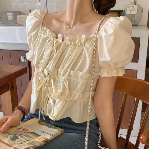 [옷자락]여성 스퀘어넥 오프숄더 셔링 리본 크롭 블라우스