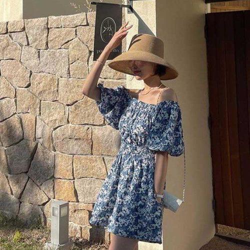 플로랄 오프숄더 스모크 점프수트 여성 여름 퍼프 소매 반바지 셋업 휴양지룩 여행룩 점프슈트