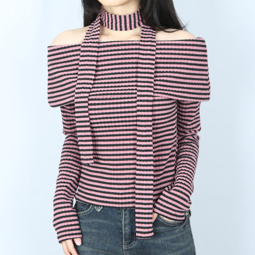 파라노말샵 / 3색 단가라 오프숄더 머플러 긴팔 크롭티 (파라노말샵