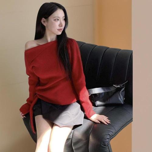 [미라클세븐]여성 울 혼합 원 오프 숄더 리본 스트랩 언발란스 니트