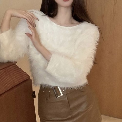 [디어로우]D117 라운드 오프숄더 퍼 크롭 니트