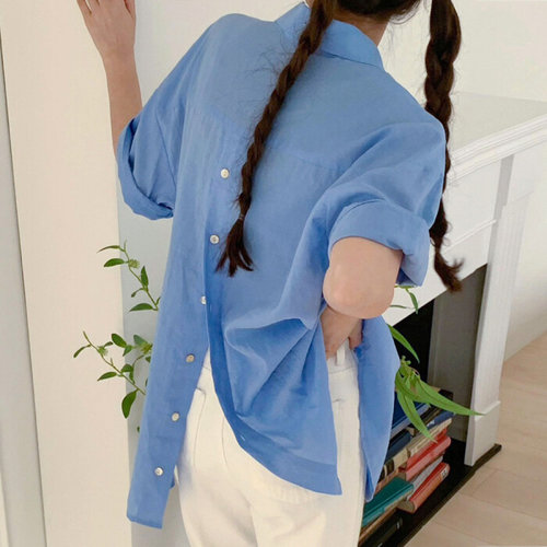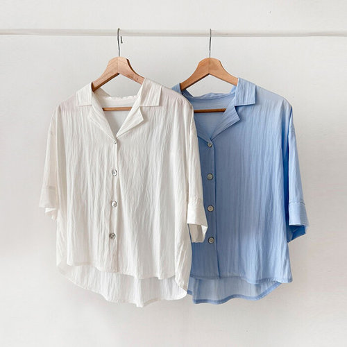 [에이치플러스몰]클래식오픈카라 박시핏 솔리드 5부반팔 셔츠블라우스