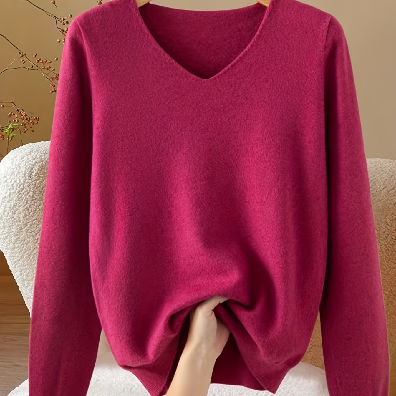 TEMU 여성 패션 솔리드 컬러 V넥 긴팔 풀오버 스웨터