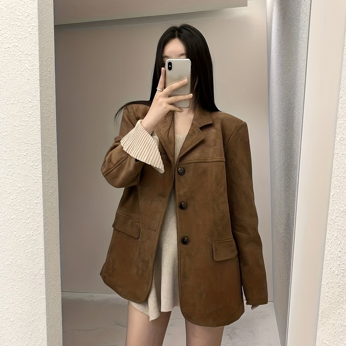 TEMU 여성용 한국 스타일 오버사이즈 브라운 모브(토프) 재킷 - 겨울용 따뜻한 칼라 코트, 싱글 브레스트 버튼 프론트, 한국 웨이브 스타일 캐주얼 , 가을/겨울용, 손세탁 가능한 루즈핏 아우터웨어