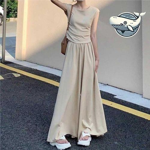 [에이치플러스몰]허리 셔링 나시 핀턱 와이드 스커트 투피스