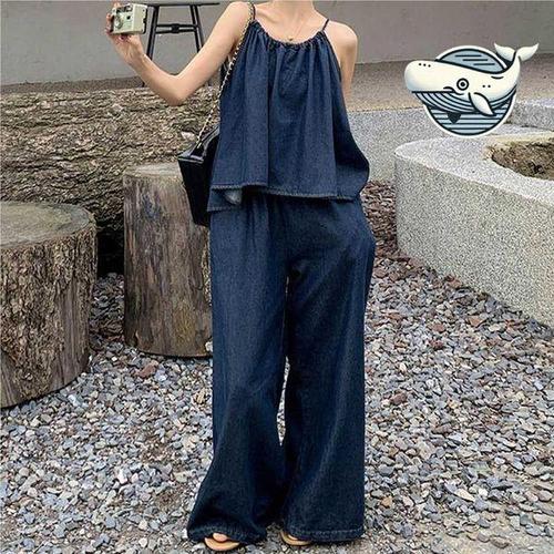 [에이치플러스몰]여름 빈티지 와이드 스트랩 투피스 캐주얼