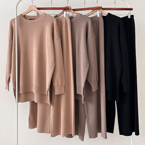 [문에이블]문에이블 여자 여성 겨울 루즈핏 브이넥 니트 밴딩 와이드 팬츠 편한 투피스 세트