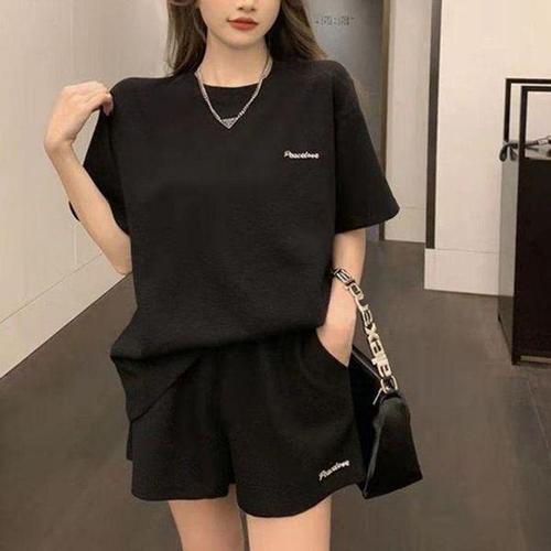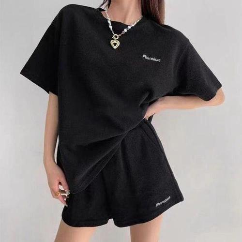 [신상오픈런]여성 심플 레터링 와플 찰랑핏 반팔 티셔츠와 반바지 세트