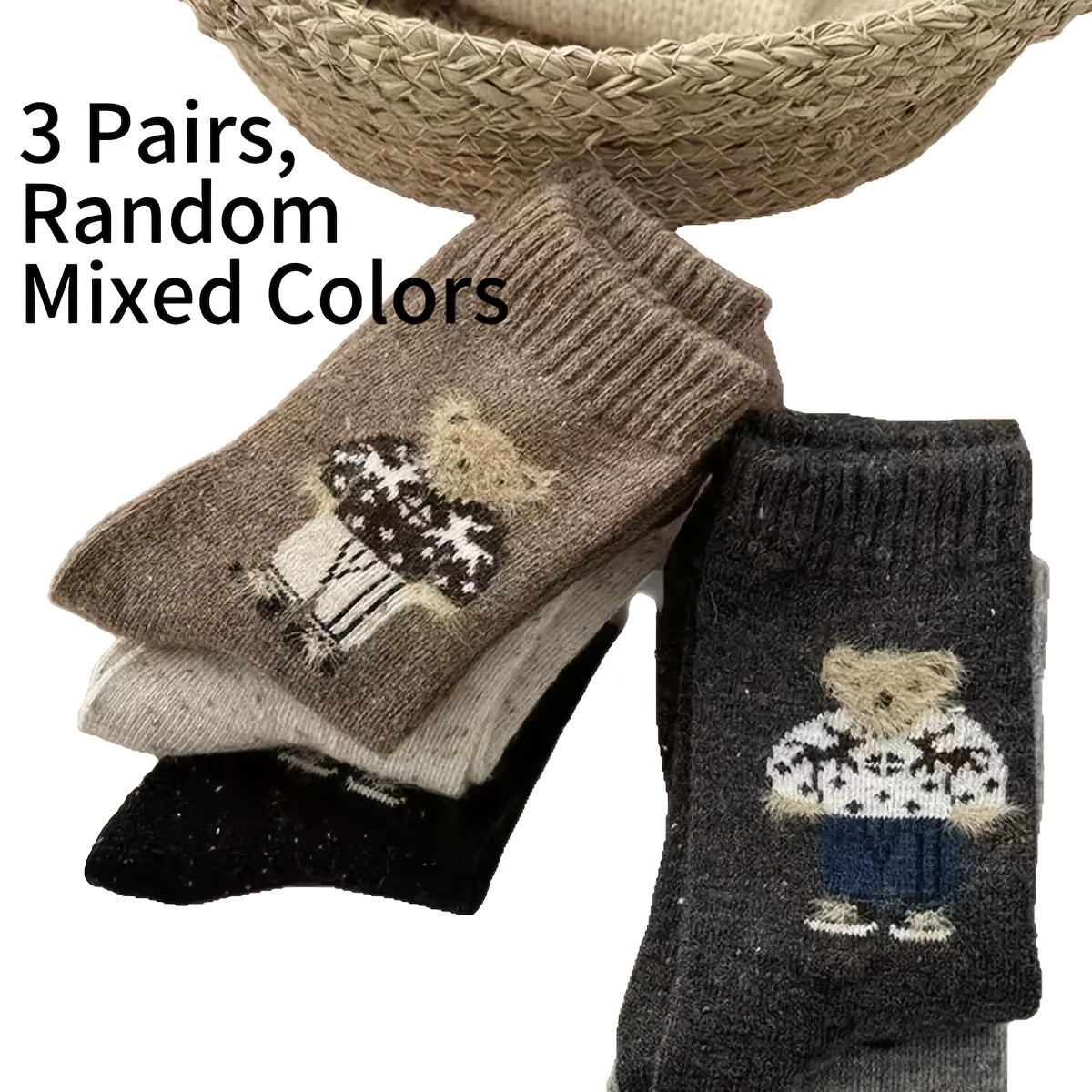 TEMU 여성용 귀여운 곰돌이 미드-카프 양말 3켤레 | 가을/겨울 따뜻한 미끄럼 방지, 브라운/블루/레드 색상, 재미있는 만화 패턴, 데일리/특수한 날에 적합, 필수 실내복