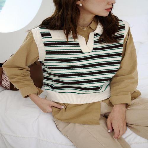 [우일인견]여성 스트라이프 카라 니트 베스트
