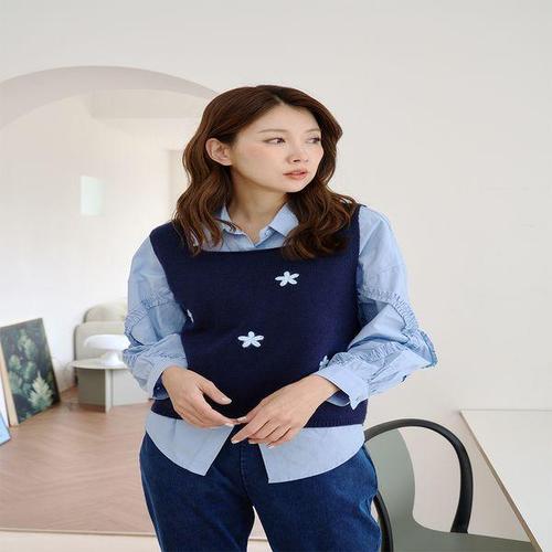 [우일인견]여성 꽃 포인트 뷔스띠에 니트 베스트