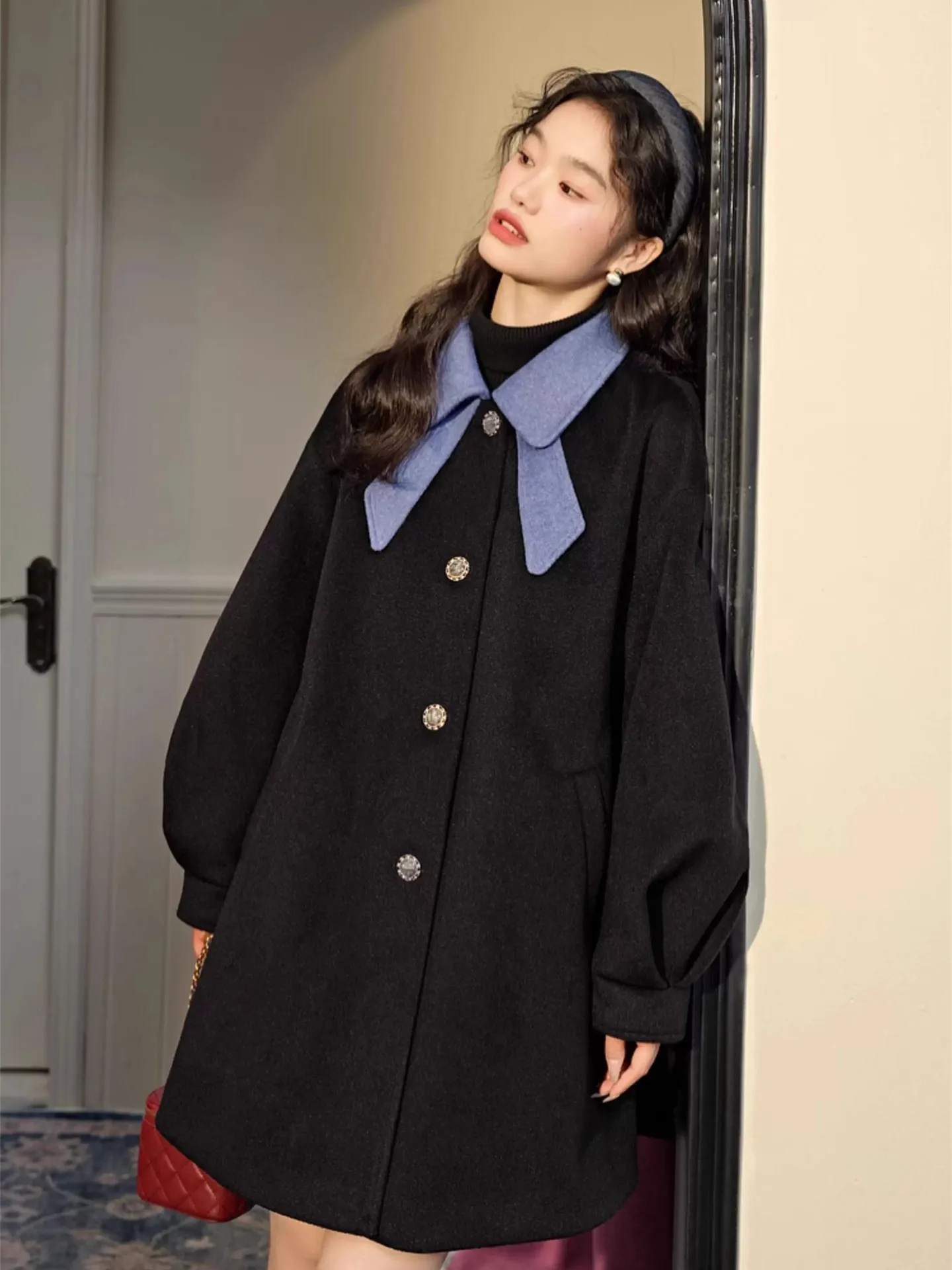한국 스타일 울 코트 여성용 시크한 분위기 달콤한 리본 칼라 후드 따뜻한 울 코트 긴 소매 중간 길이