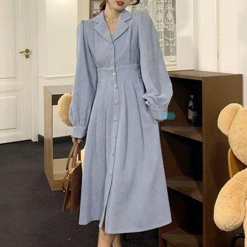 [모노무드]LMO 여성용코듀로이원단 밴드 칼라넥 롱핏 미니드레스 모던