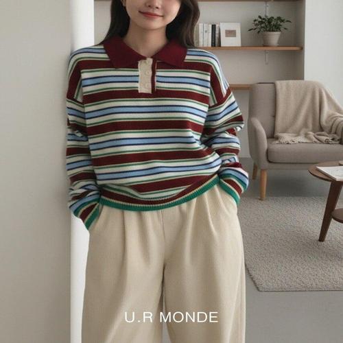 [유아몽드]스트라이프 배색 단가라 긴소매 니트티 3버튼 카라넥