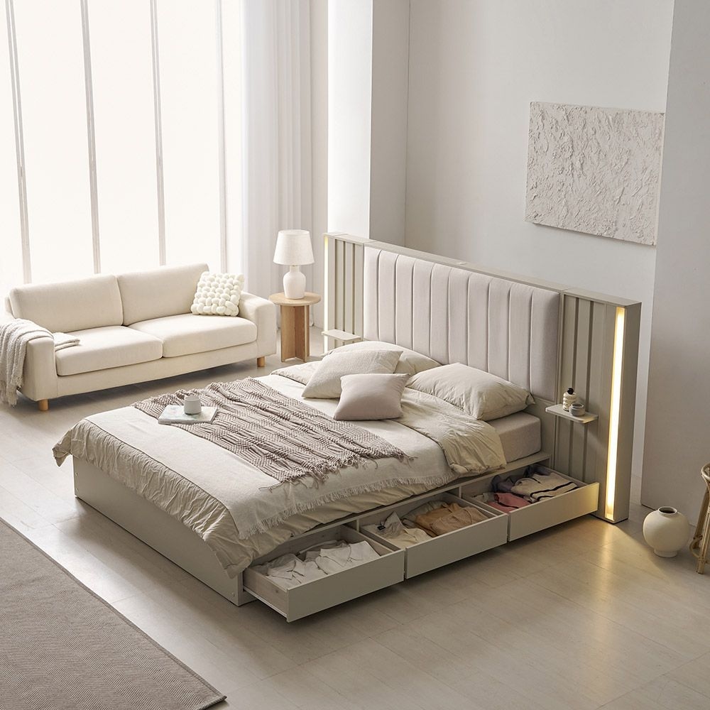 루미너스 기능성 패브릭 쿠션헤드 LED조명 수납형 침대프레임 SS/Q/K/LK