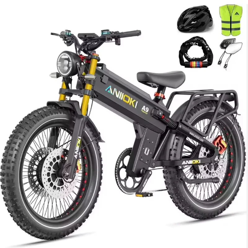 저렴한 신형 ANIIOKII 6000W A9 프로 맥스 듀얼 모터 전기 자전거 60V 70/80ah 배터리 26 * 4.8인치 팻 타이어 더트 바이크