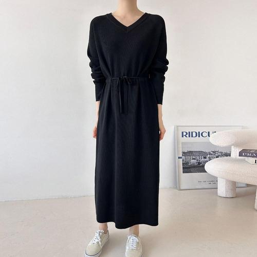 besteffie 여성 가을 겨울 니트 롱 원피스 긴팔 여유로운 핏 일자 무지 간편한 착용감