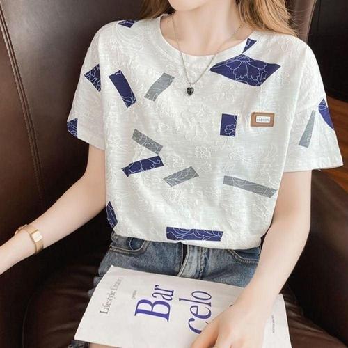 여자 프린트티 여름 솔리드 라운드 입체 프린트 순면 반팔 티셔츠 원픽2