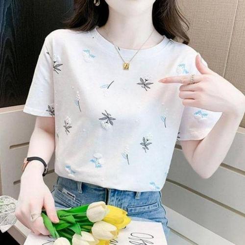 꽃잎 WJ74ON65 푸른 봄 여성 입체꽃 반팔티셔츠 여름 여유핏