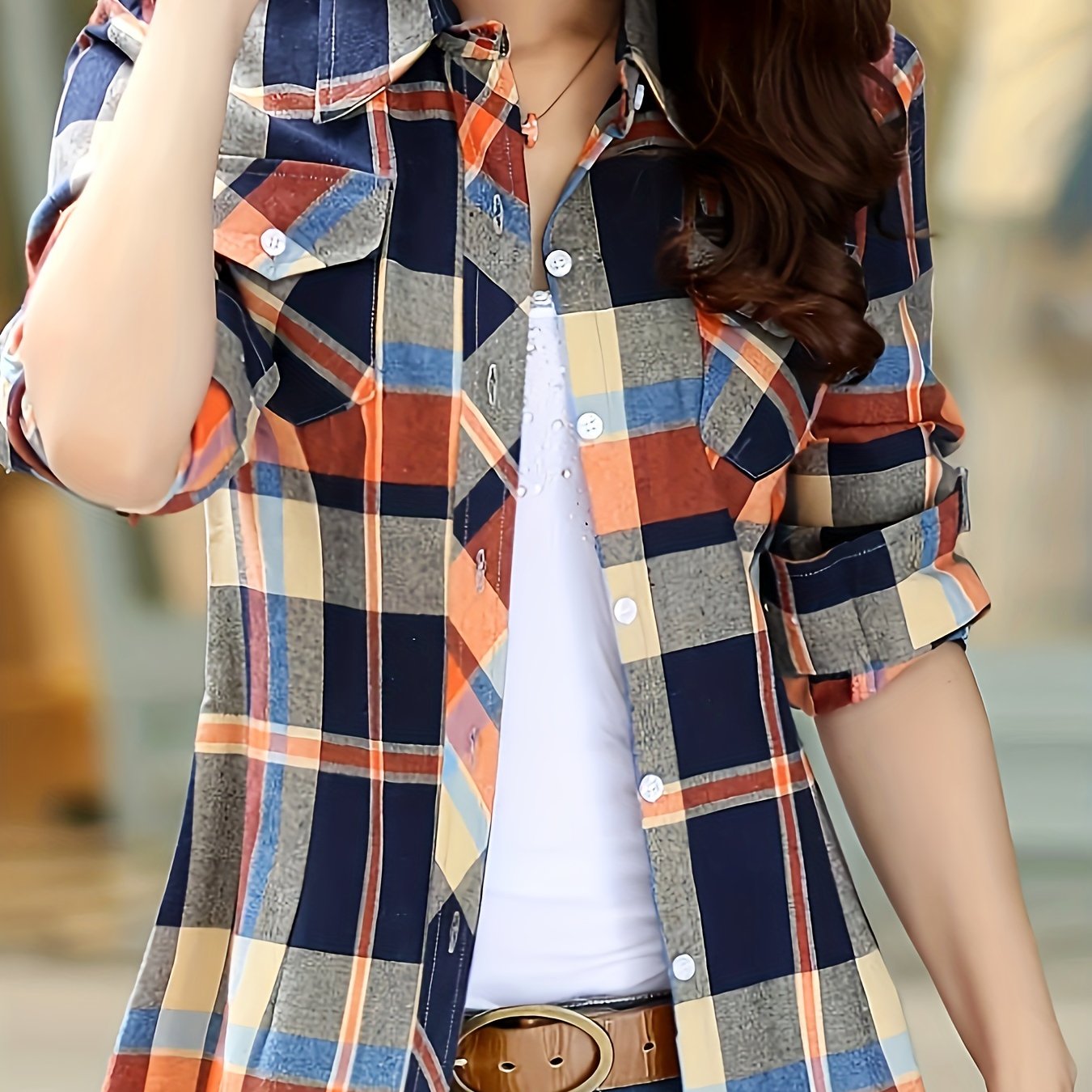 TEMU 체크 셔츠 재킷 - 캐주얼 버튼 프론트 , 스모크 칼라 & 스모크 패널, 베이지/브라운/블랙/화이트 체크 패턴, 기계 세탁 가능한 봄/가을 아우터웨어 (진 또는 드레스용)|블라우스|셔츠|여성블라우스
