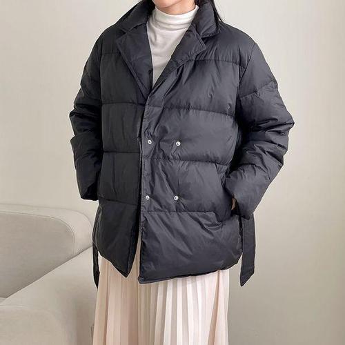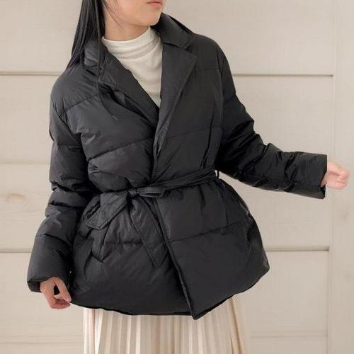 [신상오픈런]여자 겨울 오리털 리본끈 벨티드 카라 블랙 패딩 점퍼